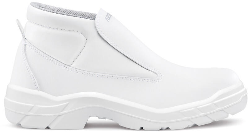 Fehér munkavédelmi bakancs hidrofób mikroszálas felsőrésszel, mely jó légáteresztő képességgel bír. Csúszásmentes talppal és széles kialakítású acél orrkaplival. Ideális választás élelmiszeripari vagy hideg környezetben történő munkavégzéshez. Felsőrész A cipő felső része hidrofób mikroszálas 2.2 mm vastag MICRO PRO bőrből készült, mely kiváló ellenáll