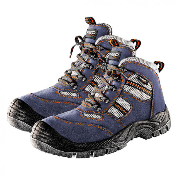 A NEO munkavédelmi magas szárú cipő alapvető védőeszköz a munkavégzéshez. A felsőrész kiváló minőségű hasított bőrből készül. A lélegző textilbetétek jó szellőzést biztosítanak. A rezgéselnyelő rendszerrel ellátott csúszásmentes talp gondoskodik a kényelemről és a biztonságról. Az átszúrás ellen védő fém betét és a megerősített fém orrmerevítő v