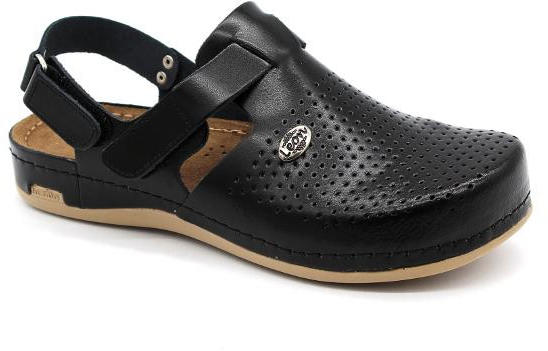 Női bőr klumpa/szandál, műanyag csúszásgátlós talppal. Oldalt és hátul tépőzárral szabályozható. A talpbetét puha zselés, bőr. A természetes anyagnak és a felsőrész lyukacsosságának köszönhetően , jól szellőzik. Ajánlott mindennapos használatra: utcára vagy munkahelyre ( több órás, szaladgálós munka alatt sem fárad el a láb ). Ez a termékünk rendelkezik min