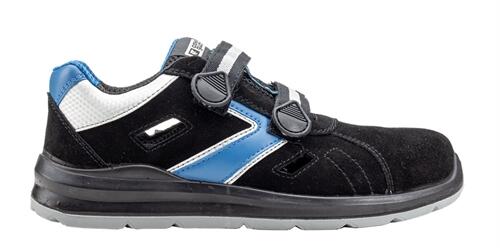 biztonsági védőszandál puha, szellőző velúrbőr felsőrésszel és hálós betétekkel fekete és kék/fehér színben antisztatikus, olajálló, hajlékony kétrétegű PU talp SRC csúszásmentességgel kényelmes és könnyű kompozit lábujjvédő leeső tárgyak ellen fémmentes textil átszúrás mentes talplemez szivaccsal párnázott boka, szellőző3D hálós belső bélés széles