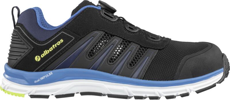 646200 Albatros Védőcipő - Ultratrail Black Low S3 ESD HRO SRC Teljesen fémmentes! Üvegszálas orrmerevítő vel és hajlékony kerámiaszál as talpátszúrás elleni védelemmel van ellátva. Bőr felsőrész, kopásálló textil illesztésekkel. Anatómiailag kialakított, kivehető talpbetéttel. ESD tulajdonság. Magas minőségű, 300°C-ig hőálló , csúszásmentes, gumi talp, Impuls