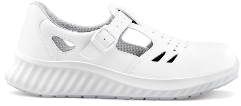 Kényelmes, jól szellőző munkavédelmi szandál hidrofób mikroszálas felsőrésszel. Tökéletes választás egészségügyi és élelmiszeripari dolgozóknak. A szandál felsőrészének bősége csattal állítható. Felsőrész A cipő felső része hidrofób mikroszálas 2.2 mm vastag MICRO PRO bőrből készült, mely kiváló ellenállóképességet biztosít, valamint jó légátereszt
