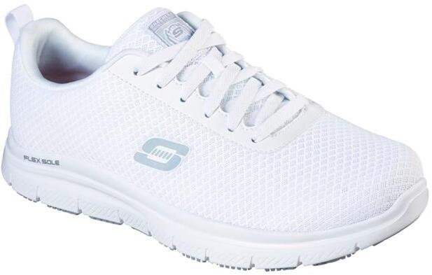 Sportos stílus, biztonság és kényelem. Csúszásmentes, fűzős, tartós, sportos hálós és szintetikus felsőrésszel, kompozit biztonsági orrésszel és párnázott Skechers Air-Cooled Memory Foam talpbetéttel. Csúszásmentes gumitalp, az ASTM F1677-96 Mark II szabványok szerint tesztelve, hogy megfeleljen még nedves és olajos felületeken is. Párnázott gallér és nyelv. Érintés