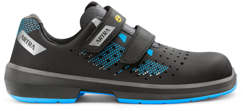 Sportos és modern kialakítású ESD-s munkavédelmi cipő tépőzárral. A hidrofób mikroszálas nubukbőr felsőrész kiváló légáteresztést biztosít, a láb védelméről extra széles anatómiai kialakítású kompozit orrmerevítő és ERGOFLEX kevlár talplemez gondoskodik. 100% fémmentes kialakítás. Felsőrész A cipő felső része hidrofób mikroszálas 2.2 mm vastag NUBUCK PRO