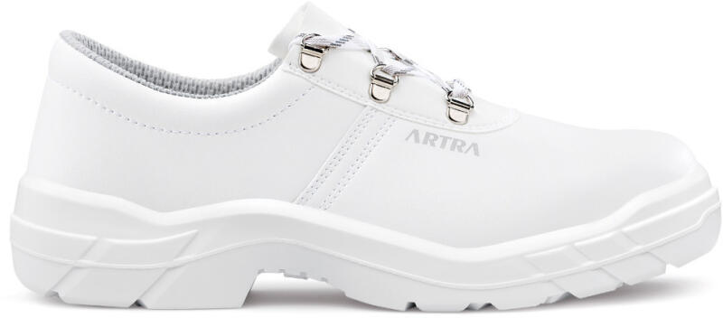 Fehér színű munkavédelmi cipő acél orrmerevítővel, hidrofób mikroszálas bőr felsőrésszel, jó légáteresztést biztosítü talpbetéttel és cipőbéléssel. Kiválóan alkalmas élelmiszeripari vagy egészségügyi dolgozók részére. Felsőrész A cipő felső része hidrofób mikroszálas 2.2 mm vastag MICRO PRO bőrből készült, mely kiváló ellenállóképességet biztosít,