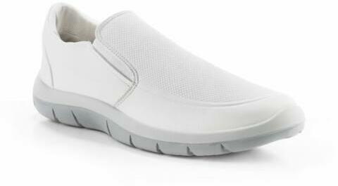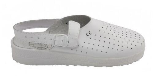 PILLE (OB FO) FEHÉR PAPUCS: antisztatikus, olajálló, csúszásmentes fehér PU talp ütődéselnyelő sarokkal fehér bőr felsőrész, hasítékbőr talpbélés, csatos sarokpánt, párnázott perem könnyű súlyú, egészségügyi, élelmiszeripari munkákhoz, egész napos viseletre ajánlott védőlábbeli