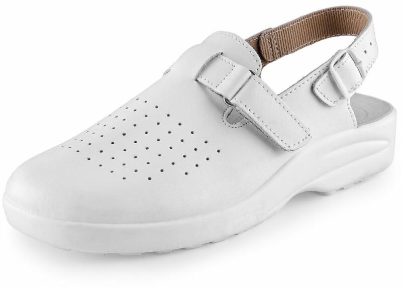 Fehér bőr klumpa, zárt orrésszel. A szandál állítható pánttal rögzíthető a sarok és a tépőzáras csat körül. A klumpa felső része perforált és marhabőrből készült poliészter béléssel rendelkezik. A talp anyaga PU. Szabvány: EN ISO 20347:2012 OB E A SRC Ehhez a szandálhoz letölthető az EU által írt szabvány. Ha nem tudod, hogy hogyan válassz megfelelő munkacipő