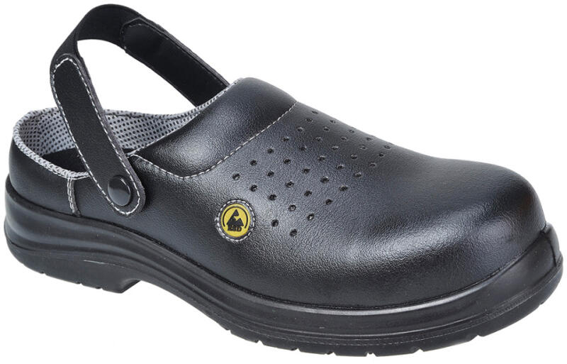 Könnyű biztonsági klumpa perforált felsőrésszel a további légáteresztő képesség érdekében. 100% fémmentes, műanyag szegecses rögzítővel. Alkalmas ESD környezetben történő használatra Megfelel az EN 61340-5-1 szabványnak.