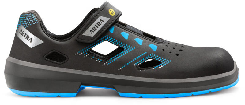Jól szellőző kényelmes ESD-s munkavédelmi szandál hidrofób mikroszálas nubukbőr felsőrésszel, anatómiailag széles kialakítású acél orrmerevítővel és kevlár talpátszúrás elleni védőlemezzel. Felsőrész A cipő felső része hidrofób mikroszálas 2.2 mm vastag NUBUCK PRO nubuk bőrből készült, mely kiváló ellenállóképességet biztosít, valamint jó légátereszt