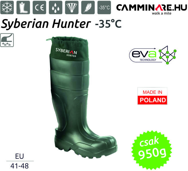 Pille könnyű, kiváló hőszigetelő képesség, különösen erős ellenálló anyag, EVA technológia, maximális hideg elleni védelem, csúszásmentes talp, 100%-os komfort érzet, vízálló. Kivehető és mosható bélés, bélés nélkül NYÁRON is használható. Vadászcsizma. Ütésálló orral, és erősített talppal. Kevlár talpátszúrás elleni védelemmel és extra magas behúzh