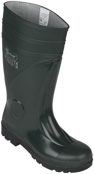 PVC S5 csizma, zöld Talp: fekete csúszásmentes, antisztatikus, sarokenergia elnyelő PVC Felsőrész: zöld PVC Bélés: vékony poliészter Acélkaplis (200 J), acél talplemezes CE, MSZ EN 20345:2012 S5, SRC MSZ EN 13832-3:2006
