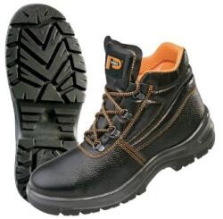 Biztonsági csizma, bőr, műanyag orrvédővel és Kevlar talpbetéttel, fényvisszaverő kiegészítőkkel. Anyaga: 1,6-1,8 mm hasított nubuk bőr felsőrész (egyrészes), külső TPU sarokvédelem, fém alkatrészek nélkül, légáteresztő kopásálló szövet bélés, PU-PU olajálló, antisztatikus, csúszásmentes talp. Méret: 37-48 Védelem: megerősített orrral és talppal Védettsé