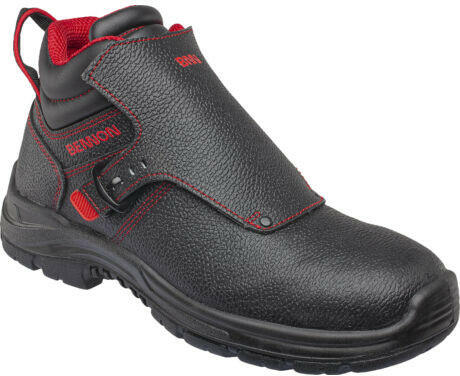 Speciális cipő hegesztők számára, csattal a gyors levételhez. Innovatív fazon a lábhoz való jobb illeszkedés érdekében. Kétkomponensű PU/gumi cipőtalp SRC csúszásgátló tulajdonságokkal, amely ellenáll a 300 °C-os kontakthőnek. Kevlár/kompozit orr-/talpmerevítő és anatómiai WARRIOR talpbetét, amely elnyeli az ütéseket a sarok területén. A felsőrész vízlepergető