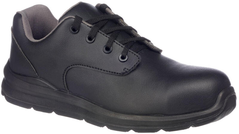 Ez a fémmentes, fűzős, mircofibre biztonsági tréner antimikrobiális bélést, talpbetétet és letörölhető felsőrészt kínál. A párnázott bélés egész napos kényelmet biztosít. Tökéletes az élelmiszeripar, a gyógyszeripar, a vendéglátás és a vendéglátóipar számára. Párnázott cipőnyelv a nagyobb kényelemért Vegán bőr lábbeli Antibakteriálisan kezelt, perforá