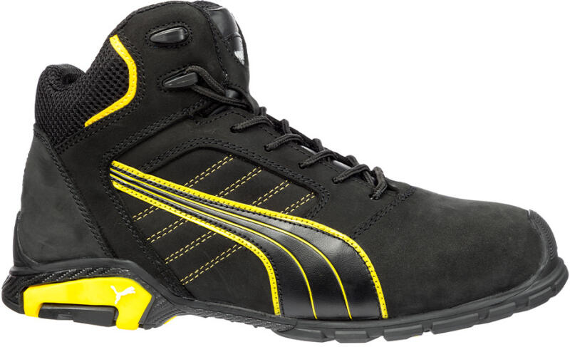 Magas kivágású férfi bőr biztonsági cipő. Külső védelem a cipő orrán/végén, hogy megakadályozza a kopást térdeléskor. Szúrásálló antisztatikus talp. Vízállóság. Csúszásgátló.