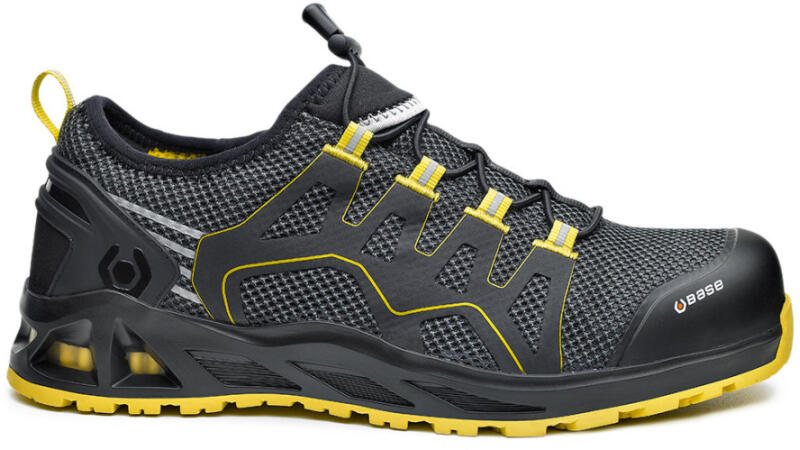 Base S3 újrahasznosított anyagokból készített védőlábbeli. 200 Joule-nak ellenálló kapli, talpátszúrás elleni védelem, ütéscsillapítás a saroknál, antisztatikus lábbeli, ESD védelem, szénhidrogének ellenálló talpszerkezet, méretre készült ortopédiai talpbetét, amely megfelel az európai normáknak DGUV112-191, fémmentes kivitel, mérettől függően férfi és női k