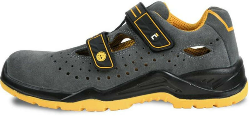 C0203015100042 YUWILL MF ESD S1P SRC nubuk bőr, fémmentes szandál Biztonsági szandál szürke-sárga színkombinációban. A szandál felső része nubuk bőrből készült, teljes hosszában perforált. Az olajálló csúszásgátló talp kettős sűrűségű poliuretánból készül. A lábbelik kényelmes, perforált belső talpbetéttel, energiaelnyelő sarokkal, kompozit orrmerevítővel,