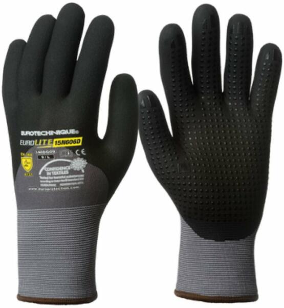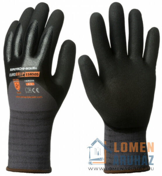 Tökéletesen kézre simuló, szellőző tenyér és kézfej EUROLITE 15-ös kötésű, erős szakítás- és kopásállóságú szürke nylon / spandex ökölcsontig fekete szellőző mikrohabosított nitrillel mártott, tenyerén csúszásbiztos pettyekkel szellőző kézhát, gumírozott mandzsetta könnyű, kiemelten komfortos, teljesen kézre simuló formai kialakítás, tenyerén és a kézh