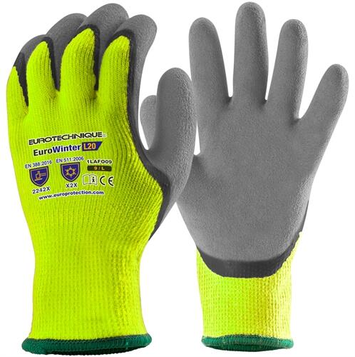 Kényelmes, kézre simuló, nedves környezetben is csúszásbiztos 10-es kötésű, Hi-Viz sárga színű, bélelt akril kesztyű tenyerén speciálisan csúszásbiztos és vízálló szürke habosított latex-szel mártva könnyű, nagyon kényelmes, kézre simuló forma, nagy ellenálló képességgel és nedves környezetben is extra csúszásbiztossággal minősített hideg elleni védelem, m