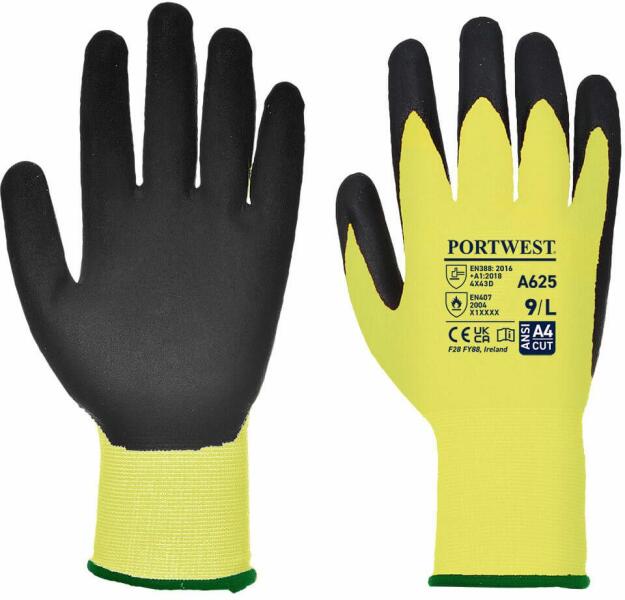 D szintű vágásbiztosságot garantáló védőkesztyű PU bevonattal, jól láthatósági színekben. A HPPE alapanyag 1-es szintű kontakt hő elleni védelmet biztosít. Jellemzők D szintű vágásbiztosság Kötési sűrűség 13 Sima PU bevonat, mely fokozott kopásállóságot biztosít Jól láthatósági szín a nappali láthatóságért Védelem a kontakt hő ellen 100°C-ig Tenyér bev