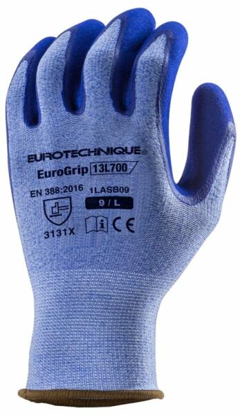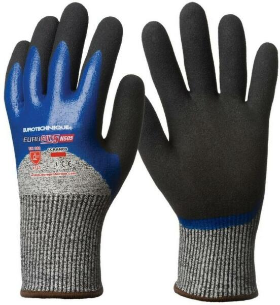 Maximális 5-ös szinten vágásbiztos HPPE + üvegszál alapanyagú kesztyű EUROCUT 13-as kötésű, legmagasabb szintű szakítás- és kopásállóságú, szúrásbiztos illetve maximális 5-ös szinten vágásbiztos HPPE (high performance PE) + üvegszál alapanyagú védőkesztyű ökölcsontig kék sima nitril mártás + a tenyerén fekete speciális Sandy csúszásbiztos nitril réteg a m