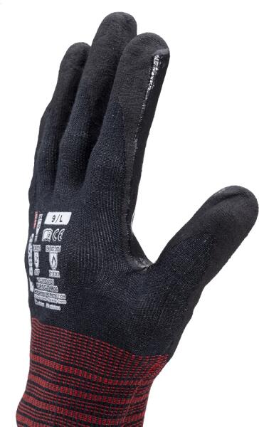 Kényelmes, 100°C kontakthőig véd, érintőképernyőhöz is alkalmazható maximális szakítás- és kopásállóságú, a legmagasabb F szintű TDM vágásbiztossággal, 18-as kötésű, vékony multiszálas (HDPE, para-aramid és spandex alapanyagú) fekete védőkesztyű tenyerén csúszásbiztos fekete mikrohabosított nitril mártás nitril megerősítés a mutató- és hüvelykujj közö