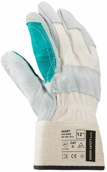 A Mary rakodókesztyű prémium hasított marhabőr erősített tenyérrésszel, és vászon kézháttal készült. Ökölcsont, artéria és újj erösítéssel rendelkezik. Mérettáblázat . A kesztyű megfelel az EN388: 4134 , EN407: 42XXXX szabványnak. TULAJDONSÁGOK Anyag: Hasított marhabőr/Vászon Újj, artéria, ökölcsont védelem Méretek: 10,5
