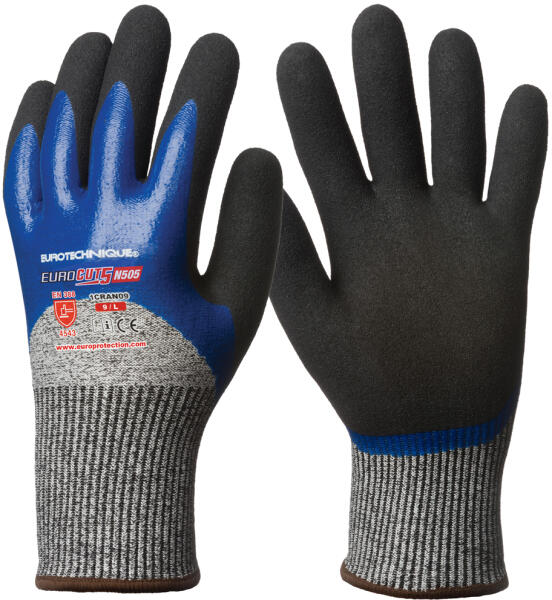 Maximális 5-ös szinten vágásbiztos HPPE + üvegszál alapanyagú kesztyű EUROCUT 13-as kötésű, legmagasabb szintű szakítás- és kopásállóságú, szúrásbiztos illetve maximális 5-ös szinten vágásbiztos HPPE (high performance PE) + üvegszál alapanyagú védőkesztyű ökölcsontig kék sima nitril mártás + a tenyerén fekete speciális Sandy csúszásbiztos nitril réteg a m