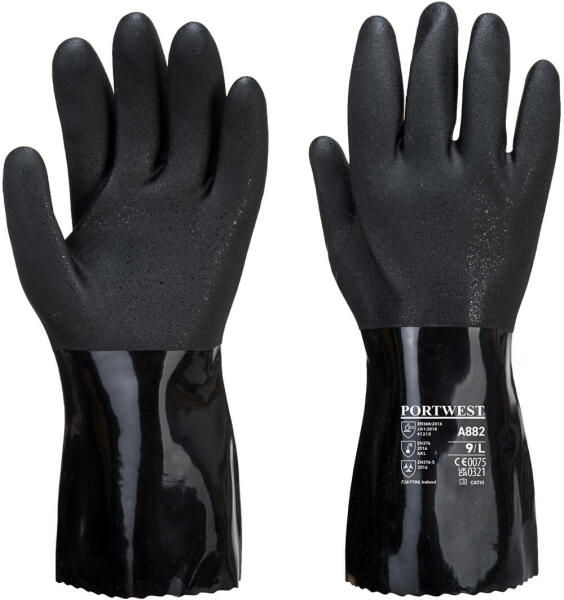 Prémium minőségű ESD PVC vegyszerálló kesztyű 30 cm Olyan területeken való használatra tervezték ahol a statikus feltöltődés veszélyt jelenthet Kitűnő mozgásszabadság és tapadás a homok szórt tenyérnek köszönhetően A varratmentes bélés biztosítja a kényelmet és a rugalmasságot. CE minősítés ESD Anyagok: Pamut, Acélszál, PVC, PVC Sandy A termék megfelel a köve