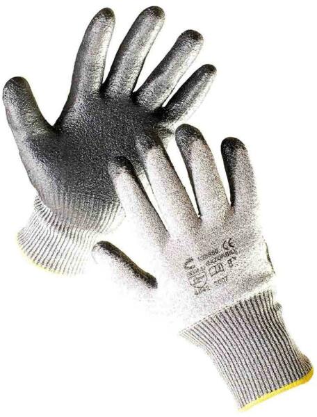 Vékony anyagú, poliuretánba mártott munkavédelmi kesztyű Kötött vágásbiztos munkavédelmi védőkesztyű, 3-as vágásbiztonsággal. Spandex/üvegszál-nylon alapanyag, tenyéren PU mártással, rugalmas mandzsettával. Szín: szürke Kiszerelése : 12 pár / csomag. Minimális rendelési mennyiség 1 csomag /méret. A gyári bontatlan karton 120 pár kesztyűt tartalmaz. Ez a munkavéde