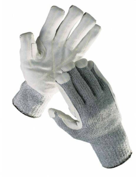 Ez a vágásbiztos munkavédelmi kesztyű megfelel az EN 388 szabványnak. 5. osztályú vágásállóságú, módosított üvegszálból, Spandexből és nylonból kötött, varratmentes munkavédelmi kesztyű hasított marhabőrrel erősített tenyérrel és ujjakkal, kettős réteggel a hüvelykujj és a mutatóujj között, valamint átfedett ujjhegyekkel. Ez a munkavédelmi védőkesztyű 12