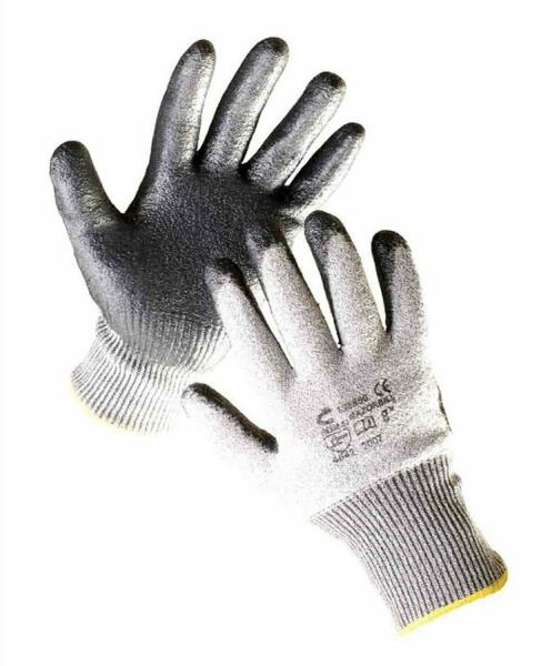 Kézre simuló vágásbiztos kesztyű A termék megfelel az EN 388 szabványnak. 5. osztályú vágásállóságú, módosított üvegszálból, Spandexből és nylonból kötött, varratmentes kesztyű, HCT nitril bevonatú tenyérrel és ujjakkal. Anyag: Mártás: nitril Alapanyag: HPPE, poliamid (nejlon), Lycra®, üvegszál Mandzsetta: HPPE, poliamid (nejlon), Lycra®, üvegszál Szabványok:
