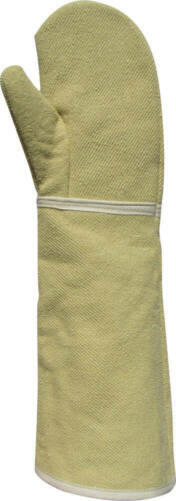 Egyujjas védőkesztyű, 50 cm-es szövött para-aramid (250° C), pamut béléssel Cikkszám: 59870 - 350 g/m 2 vastag, hő- és vágásálló, szövött para-aramid, nem bolyhos - belül teljes hosszában hőszigetelő, komfortos Aramid pamutbélés - 250 °C kontakt hőhatásnál 15 sec. időtartamig nyújt védelmet - nagy szakítószilárdságú anyag, mely véd olvadt fémcseppek ellen is -