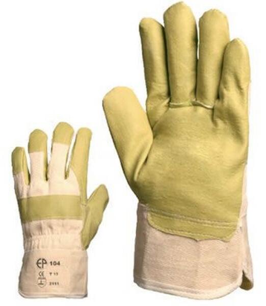 900038. cikkszám, PVC/NITRIL SÁRGA MŰBŐR KESZTYŰ: sárga műbőr (PVC/nitril) alapanyagú, egybeszabott, tenyérfolt nélküli kesztyű fehér vászon kézhát és mandzsetta artéria-, körömés ökölcsontvédő pamut tenyérbélés jobb szakítószilárdsági és vízállósági tulajdonságok MÉRET: 10-es CSOMAGOLÁS: 120/12 EU szabvány: EN420, EN388: 2111