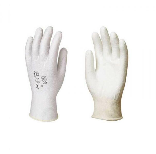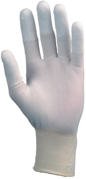 UJJBEGYEKEN FEHÉR PU MÁRTOTT PRECÍZIÓS POLIÉSZTER KESZTYŰ: kötött, rugalmas, nagy szakítószilárdságú 100% poliészter szál ujjbegyeken fehér poliuretánnal mártott finom, 13-as kötésű, precíziós kesztyű gumírozott mandzsettával, szellőző kézháttal méret: 6-os csomagolás: 100/10 EU szabvány: EN420, EN388: 0130