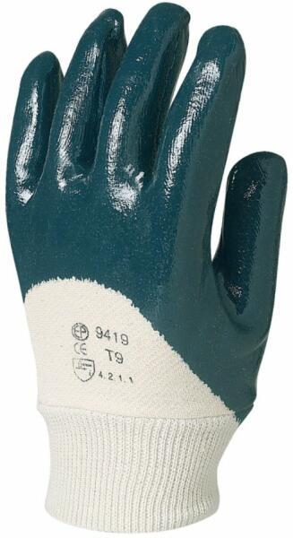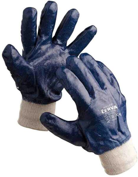 Csuklóig nitrilbe mártott védőkesztyű "ROLLER" Kötött pamutkelméből varrt, nitrilbe csuklóig mártott kesztyű rugalmas mandzsettával. Alapkesztyű anyaga: pamut A kesztyű mártás anyaga: nitril Szín:Kék A kesztyű mártása vastag de illeszkedik a kézre, ezért biztonságosan tud benne dolgozni. Minimális rendelési mennyiség 1 pár. A gyári bontatlan csomag 12 pár kesztyűt t