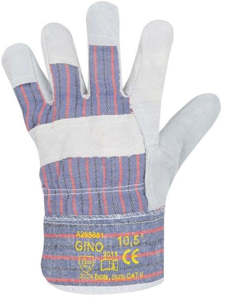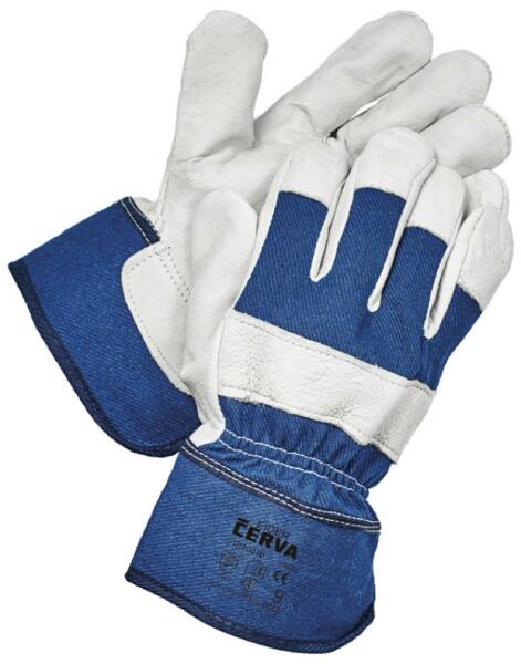 Alapanyag: marhabőr / textil Hasított bőr tenyérrész, kézhát és mandzsetta csíkos pamut anyagból. Méret: 10 / XL Minősítés: EN 388