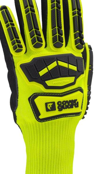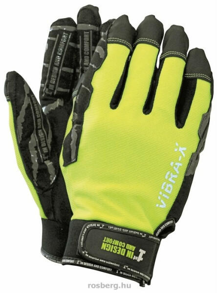 Messziről is jól látható védőkesztyű Jól láthatósági védőkesztyű, poliészter/spandex kézfejen, vízálló és lélegző membrán, mikroszálas szintetikus bőr tenyér- gyorsan szárad, 0,8 mm vastag, rezgéselnyelő hab, csúszásgátló szilikon mintával az ujjakon. Szintetikus bőr körömvédő, poliészter bélés. Neoprén mandzsetta tépőzárral. Műanyag akasztó méretje
