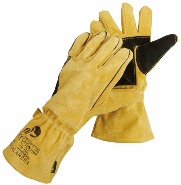 CALANDRA KEVLAR bőrkesztyű - Hasított marhabőr hegesztőkesztyű, pamut béléssel. Tenyéren és hüvelyknél erősített , kevlár cérnával varrott. Anyag: Erősítés: marha hasítottbőr Bélés: pamut, kötött Alapanyag: marha hasítottbőr Mandzsetta: marha hasítottbőr Leírás: Hasított marhabőr hegesztőkesztyű, pamut béléssel. Tenyéren és hüvelyknél erősített , kevlár