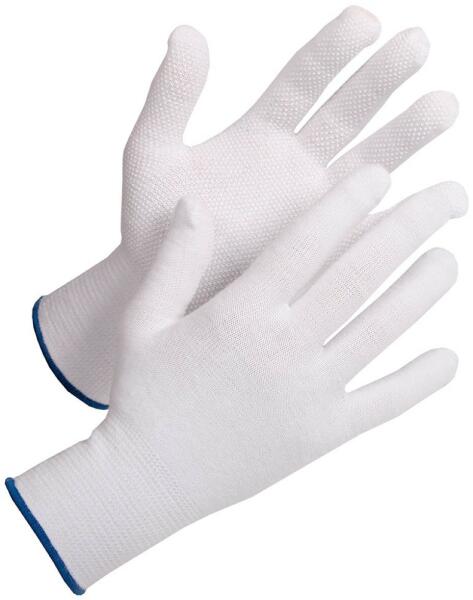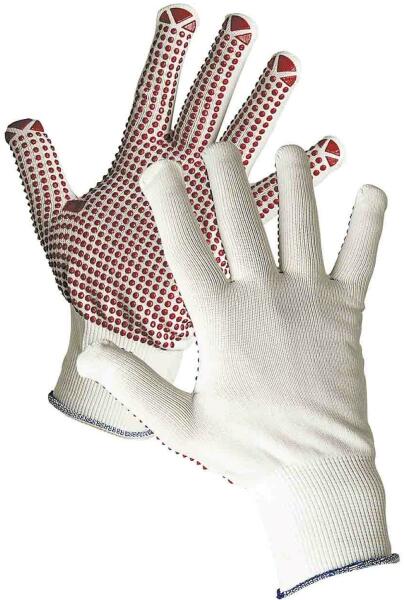 GANNET kötött, kopásálló pontozott védőkesztyű Kötött, varratmentes nylon cérnakesztyű PVC-vel pontozott tenyérrel és ujjakkal, valamint rugalmas kötött mandzsettával. Ebből a védőkesztyűből 12 pár van egy csomagban. Mimális rendelési mennyiség 1 csomag / méret. Szín: Fehér A termék megfelel az EN 388 szabványnak. 2.1. 4.1.