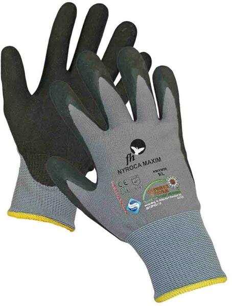 Nyroca Maxim FH mártott védőkesztyű Munkavédelmi kesztyű, nylon/lycra dzsörzé, mikroporózus nitril mártással. Kiváló folyadékállóság, jól tapad minden helyzetben: száraz, vizes és olajos környezetben is. Alapanyag: nylon/lycra dzsörzé, mikroporózus nitril mártással. Ez a mártott munkavédelmi kesztyű megfelel az EN420, EN 388 szabványoknak. Ebből a védőkesztyűből