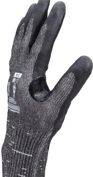 Érintőképernyőhöz is alkalmazható, kényelemes és fogásbiztos maximális szakítás- és kopásállóságú, a legmagasabb F szintű TDM vágásbiztossággal, 13-as kötésű, kényelmes, multiszálas (HPPE, poliészter és spandex alapanyagú) fekete védőkesztyű tenyerén csúszásbiztos fekete mikrohabosított nitril mártás nitril megerősítés a mutató- és hüvelykujj között