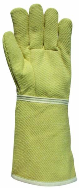 Ötujjas, 38 cm-es, szövött para-aramid (250°C), hőalló kesztyű pamut béléssel Cikkszám: 59875 - 350 g/m 2 vastag, hőálló, szövött para-aramid - belül teljes hosszában hőszigetelő, komfortos pamutbélés - 250 °C kontakt hőhatásnál 15 sec. időtartamig nyújt védelmet - nagy szakítószilárdságú anyag, mely véd olvadt fémcseppek ellen is - háromujjas változat, 38 cm h