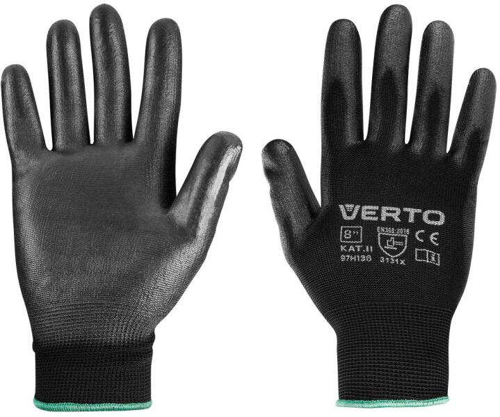 PU bevonatú kerti kesztyű, mérete 9", lélegző külső szövet, II kategória, dörzsállóság: 3, átvágásállóság: 1, tépésállóság: 3, átszúrásállóság: 1 Verto PU bevonatú kerti kesztyű rugalmas gumirozással van kialakítva a csuklónál. A kézben tartott szerszámok és anyagok tapadását növelő poliuretánnal van a tenyérrész bevonva. Az anyagösszetétel jó lég