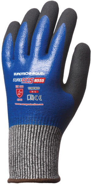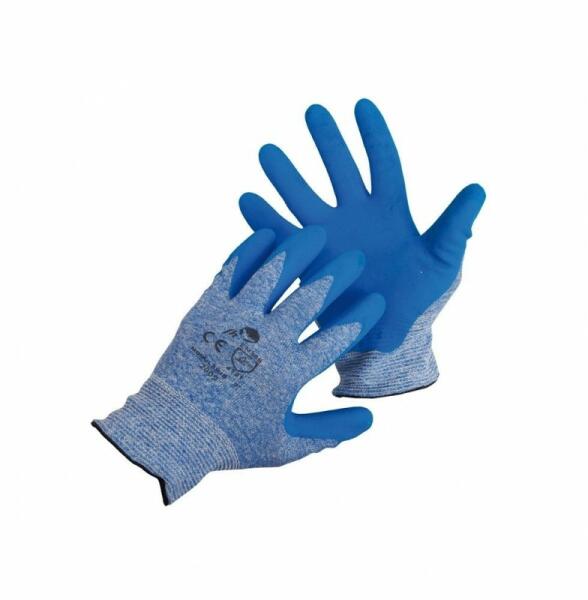 Könnyű, kifejezetten kényelmes, teljesen kézre simuló kialakítás EUROCUT 13-as kötésű, legmagasabb szintű szakítás- és kopásállóságú, szúrásbiztos illetve maximális 5-ös szinten vágásbiztos HPPE (high performance PE) + üvegszál alapanyagú védőkesztyű hátrészen végig kék sima nitril mártás + a tenyerén fekete speciális Sandy csúszásbiztos nitril réteg a má