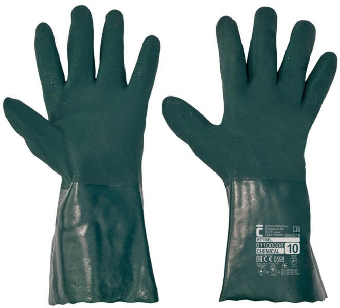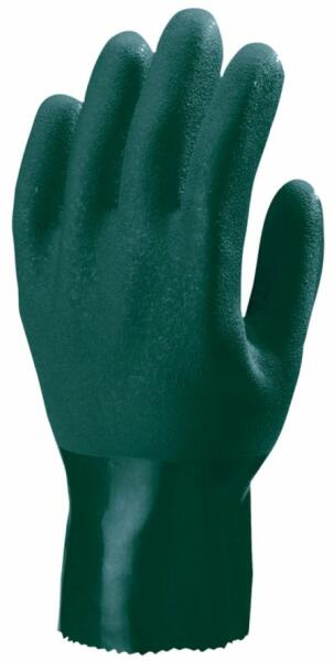 Vegyszerálló kesztyű Kötött pamutkelméből varrt, PVC-be mártott, csúszásgátló kikészítésű vegyszerálló védőkesztyű. A kesztyű teljes hossza: 35 cm. Erős, jó fogásbiztonságú, vegyszerálló, mártott védőkesztyű Szín: Zöld Méret: 10 /XL Minimális rendelési mennyiség 1 pár. A gyári bontatlan csomag 12 pár kesztyűt tartalmaz. A gyári bontatlan karton 72 pár k