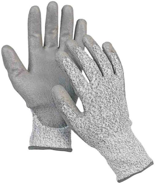 3-as vágásbiztonságú kesztyű poliuretán mártással Ez a munkavédelmi kesztyű megfelel az EN 388 szabványnak. Kötött munkavédelmi kesztyű, vágásbiztonsága 3-as szintű. Tenyéren szürke PU mártással. Ez a munkavédelmi kesztyű méretenként 12 páras csomagokban van, minimális rendelési mennyiség méretenként 1 csomag (12 pár) az egységcsomagot nem áll módunkban bontani