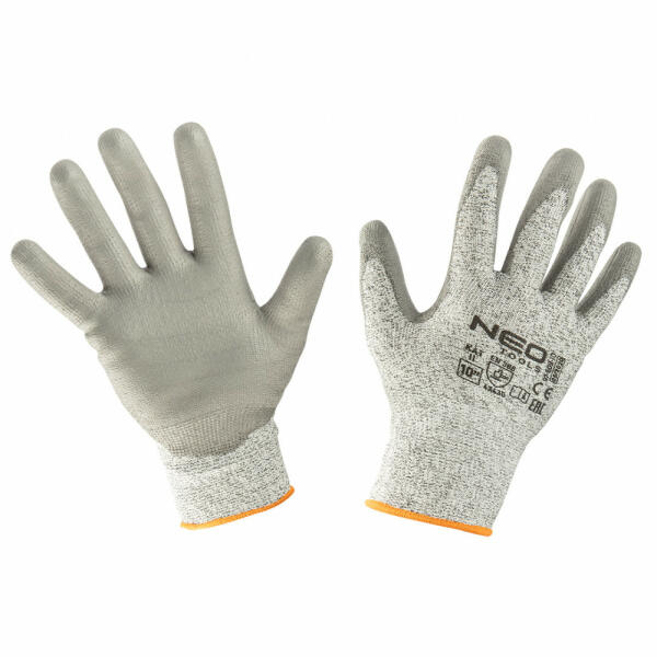 Vágásálló munkavédelmi kesztyű, PU bevonattal, 4X43D, 97-609-10, NEO - anyaga kötött, varrás nélküli, poliuretán bevonatos. Speciális vágásálló, kötött anyagból készült kesztyű, rugalmas mandzsettával. Alkalmazható a fémiparban, precíziós, szerelési, és villanyszerelési munkákhoz, mindenütt, ahol fennáll a vágás és szúrás veszélye. A kesztyű jól hozzásimu