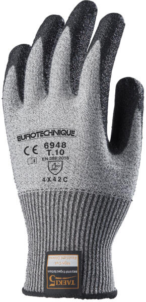 TAEKI 5 SZÜRKE MULTISZÁLAS KOPÁS-, SZAKADÁSBIZTOS TENYÉREN FEKETE NITRIL MÁRTOTT KESZTYŰ: Taeki 5® 13-as kötésű multiszálas védőkesztyű: rendkívüli kopásállóságú és szakítószilárdságú, 5-ös szinten vágásbiztos, rugalmas alapanyagok (Spandex®, szintetikus- és üvegszálak) tenyerén fekete nitril mártás rugalmas mandzsetta, szellőző kézhát, kiváló fogásbizt