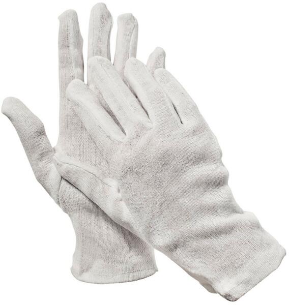 Vékony pamut kesztyűFinom fehérített kötött pamutkelméből a „fourchette szabás szerint varrt, mandzsetta nélküli cérnakesztyű. Szín: FehérMéret: 6/XS, 7/S, 8/M, 9/L, 10/XL, 11/2XL, 12/3XLCsomagolása: 12 pár / csomag